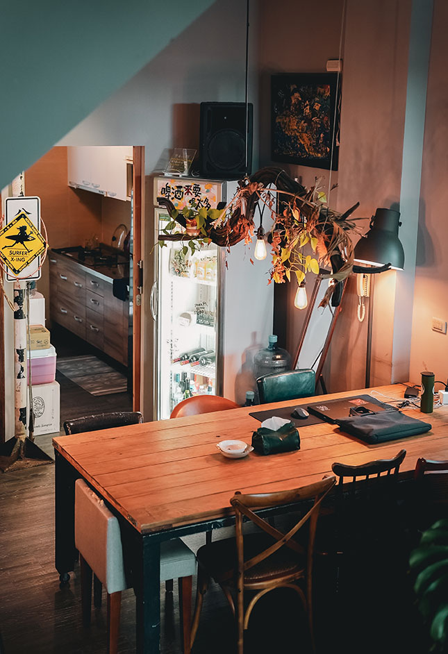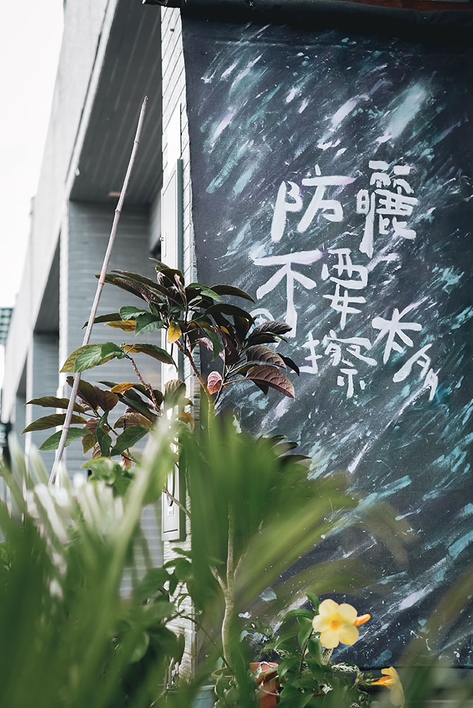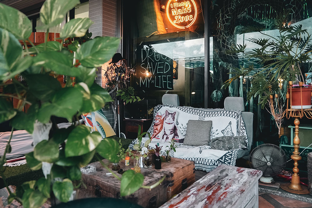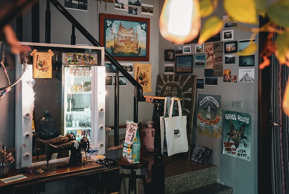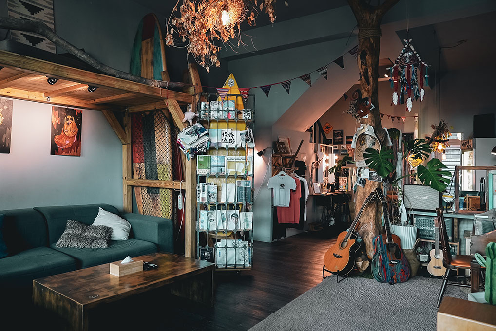 推開防曬不要擦太多的大門,將墾丁外頭的艷陽暫時卸下,空氣中的慵懶讓靈魂搖搖晃晃,彷彿走進另一個烏托邦,流瀉的樂音、腳邊的貓咪,主人之一阿福走來,穿手染背心、赤腳踏著清涼,黝黑皮膚上小小的眼睛瞇起,他笑,眼神看起來有些飄渺,就像看過太多浪的人,飄著無顧忌又溫和的沙。