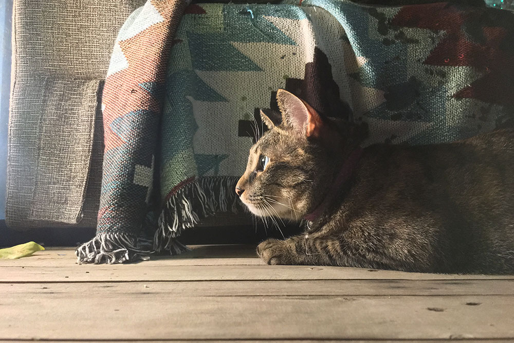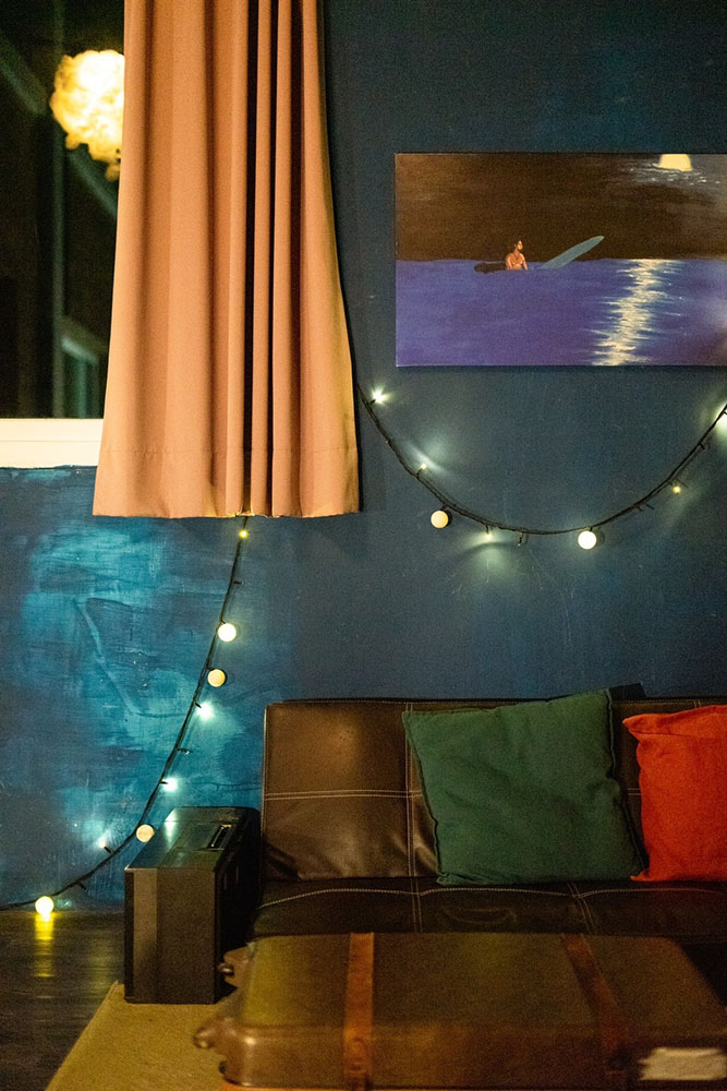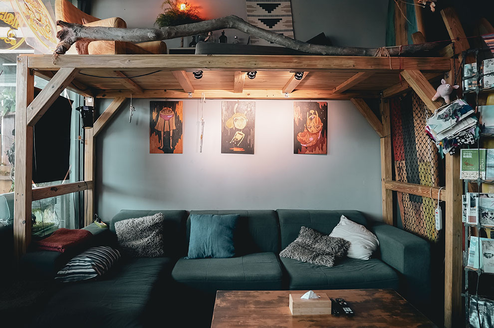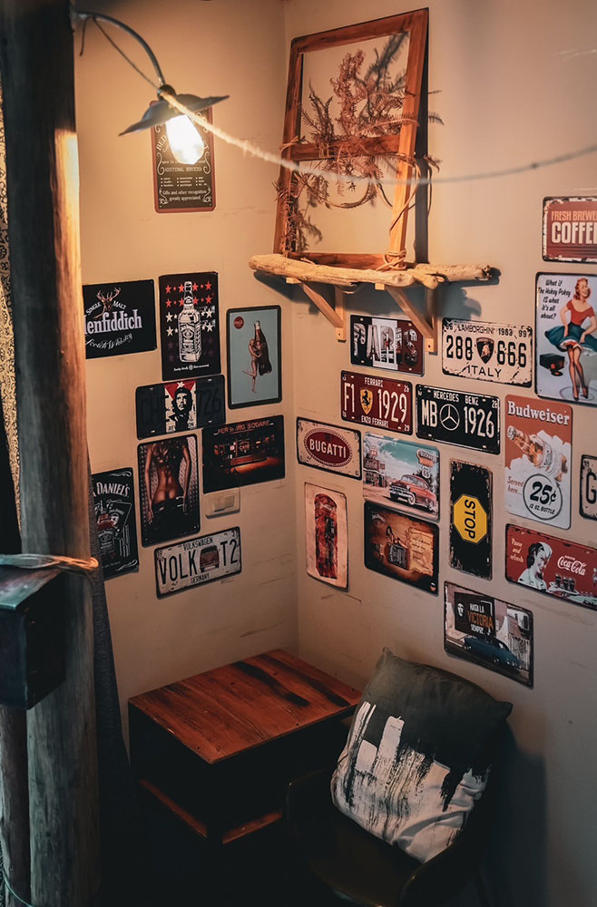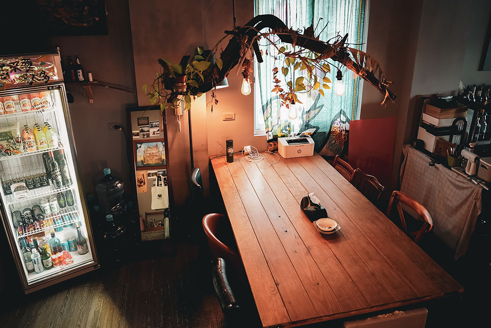 推開防曬不要擦太多的大門,將墾丁外頭的艷陽暫時卸下,空氣中的慵懶讓靈魂搖搖晃晃,彷彿走進另一個烏托邦,流瀉的樂音、腳邊的貓咪,主人之一阿福走來,穿手染背心、赤腳踏著清涼,黝黑皮膚上小小的眼睛瞇起,他笑,眼神看起來有些飄渺,就像看過太多浪的人,飄著無顧忌又溫和的沙。
